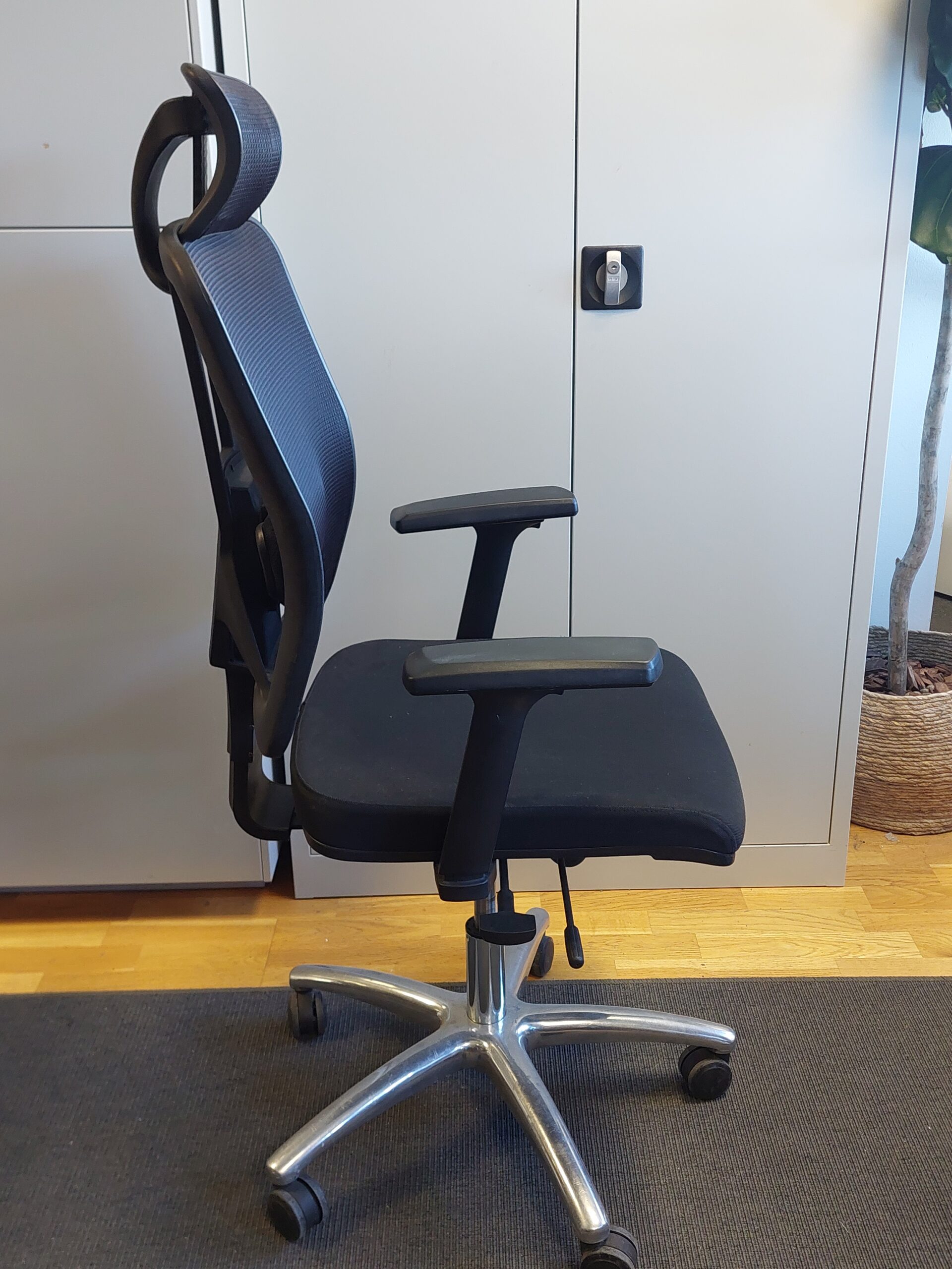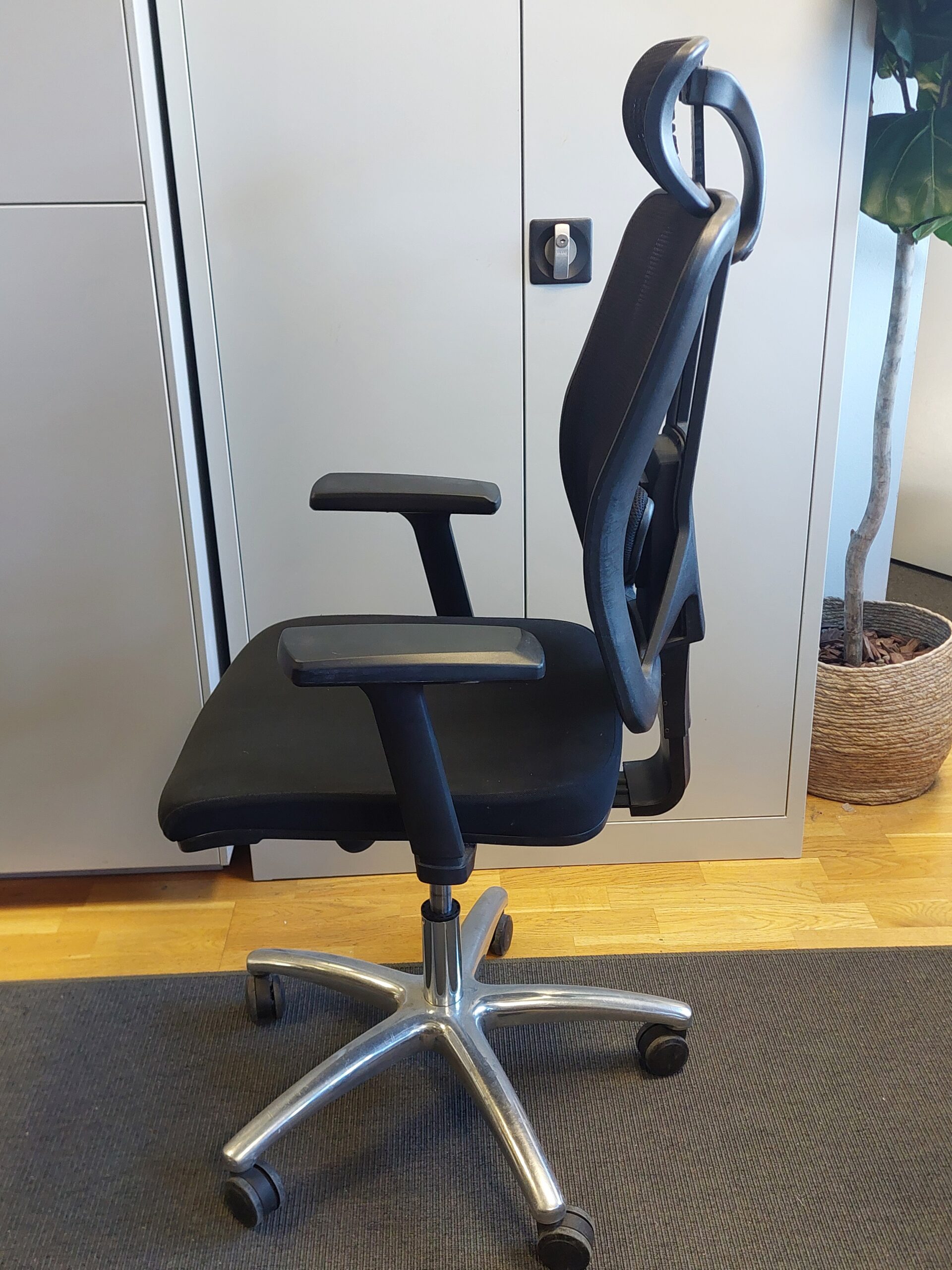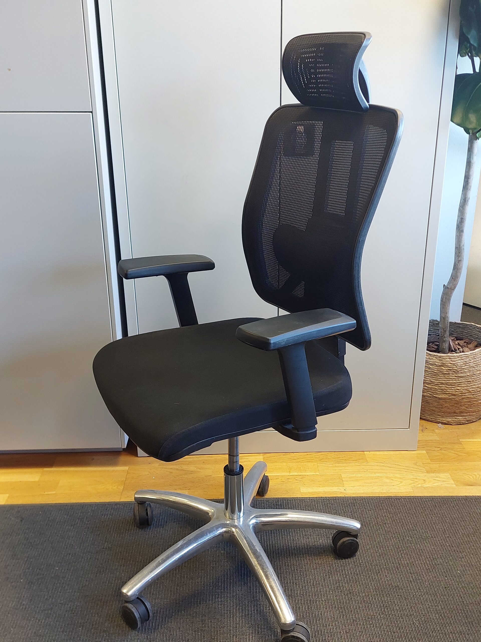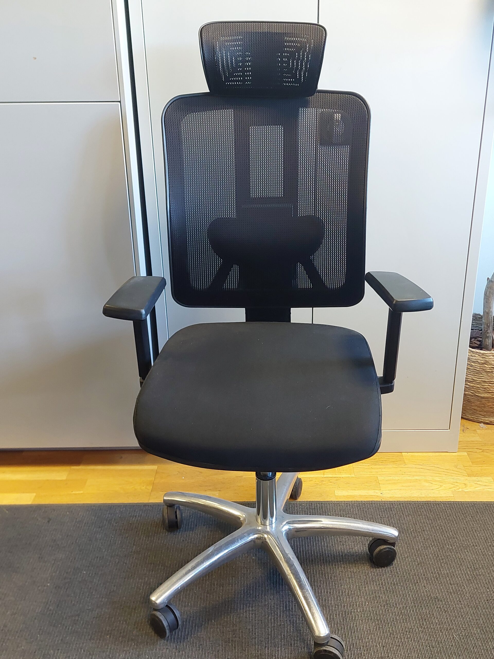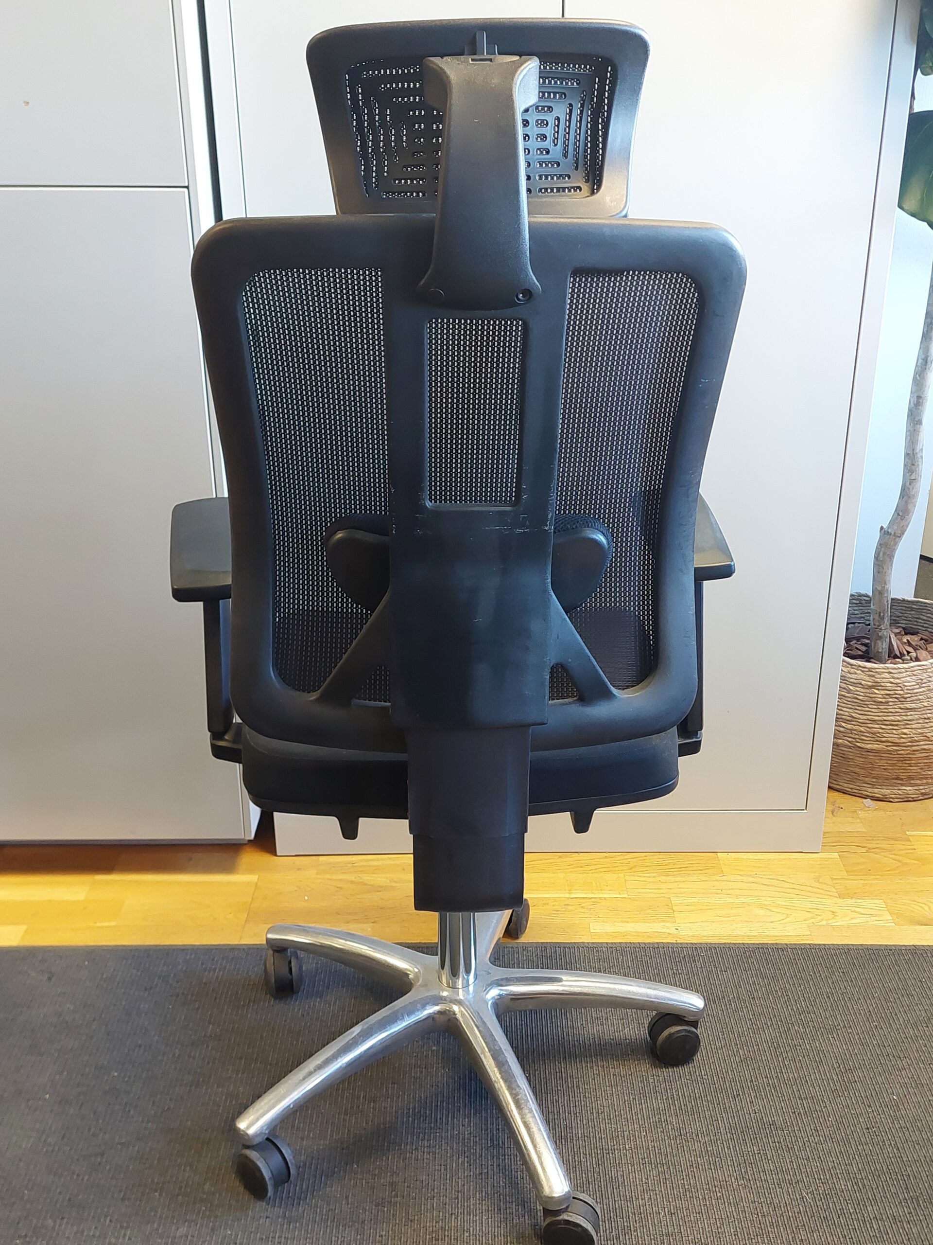 Kontorsstol med meshtyg på ryggstöd och nackstöd.