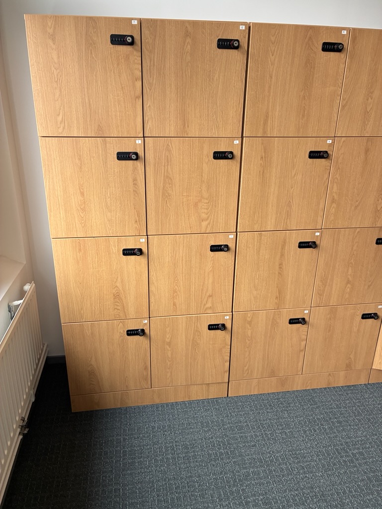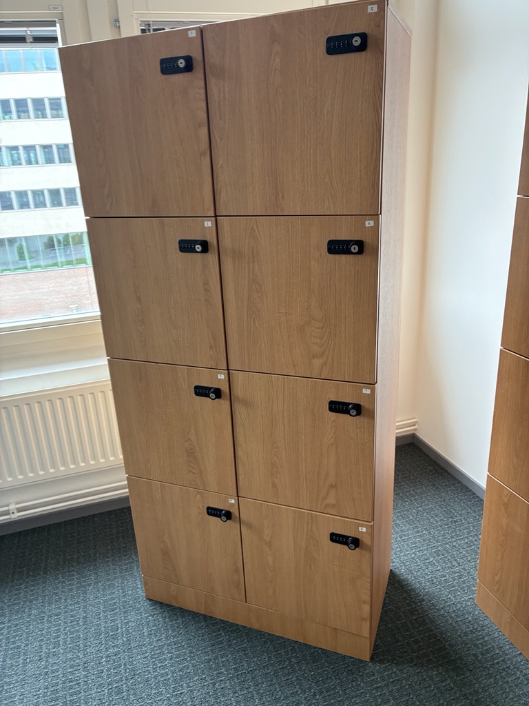 Personlig förvaring i ek med 8 st luckor med kombinationslås.